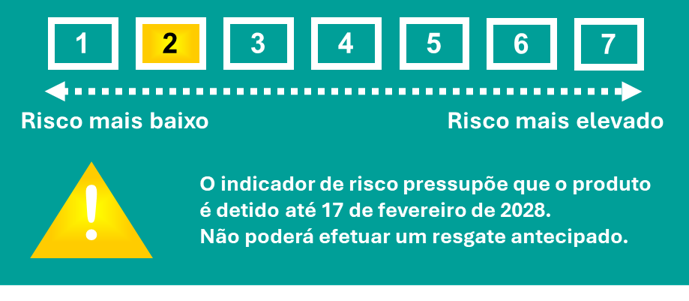 O indicador sumário de risco constitui uma orientação sobre o nível de risco deste produto quando comparado com outros produtos. Mostra a probabilidade de o produto sofrer perdas financeiras no futuro, em virtude de flutuações dos mercados ou da nossa incapacidade para lhe pagar. Classificamos este produto na classe de risco 2 numa escala de 1 a 7, que corresponde a uma baixa classe de risco. Esta classificação é ponderada por dois elementos: 1) o risco de mercado, que classifica as perdas possíveis decorrentes do desempenho futuro dos ativos subjacentes em baixo nível, e 2) o risco de crédito, que classifica como muito improvável que condições de mercado desfavoráveis tenham impacto adverso na nossa capacidade de lhe pagar.