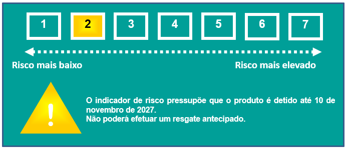 O indicador sumário de risco constitui uma orientação sobre o nível de risco deste produto quando comparado com outros produtos. Mostra a probabilidade de o produto sofrer perdas financeiras no futuro, em virtude de flutuações dos mercados ou da nossa incapacidade para lhe pagar. Classificamos este produto na classe de risco 2 numa escala de 1 a 7, que corresponde a uma baixa classe de risco. Esta classificação é ponderada por dois elementos: 1) o risco de mercado, que classifica as perdas possíveis decorrentes do desempenho futuro dos ativos subjacentes em baixo nível, e 2) o risco de crédito, que classifica como muito improvável que condições de mercado desfavoráveis tenham impacto adverso na nossa capacidade de lhe pagar.