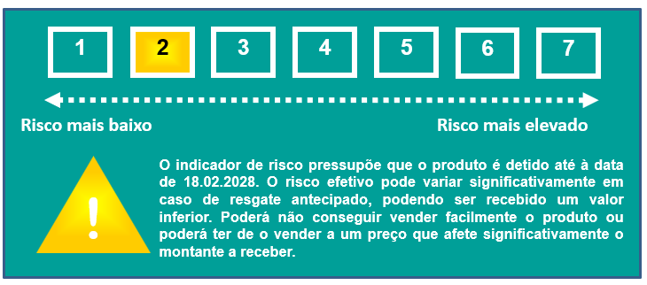 | Riscos do Investimento | O produto apresenta diferentes tipos de risco, como risco de perda de capital, risco de liquidez, risco de retorno e risco de crédito do emitente, descritos no Documento de Informação Fundamental, na secção “Quais são os riscos e qual poderá ser o meu retorno?”. |